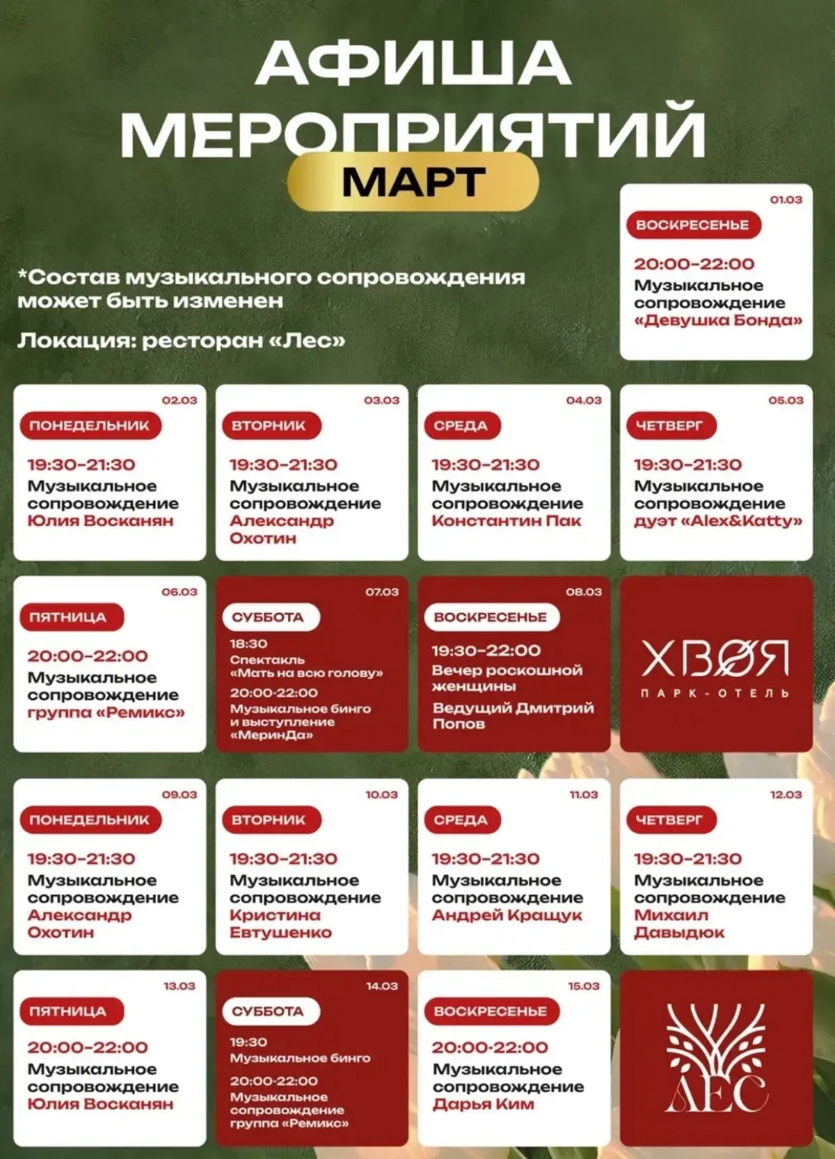 Музыкальные выступления в ресторане «Лес», праздничные программы.